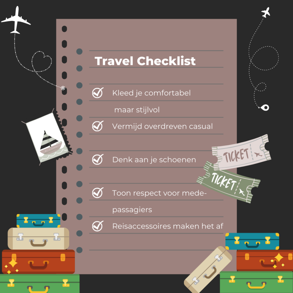 Schoenen zijn een cruciaal onderdeel van je reisoutfit. Kies voor schoenen die comfortabel zijn om in te lopen, maar ook stijlvol genoeg zijn voor een ontmoeting met mogelijke zakenpartners of vrienden bij aankomst. Sneakers kunnen een goede keuze zijn, maar vermijd versleten of vuile paren. En vooral, draag geen slippers! Met blote voeten in een vliegtuig kan echt niet!